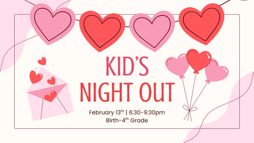 Kid's Night Out, Friday February 13, 2026. 6:30pm-9:30pm. Click the button below to register your kids!